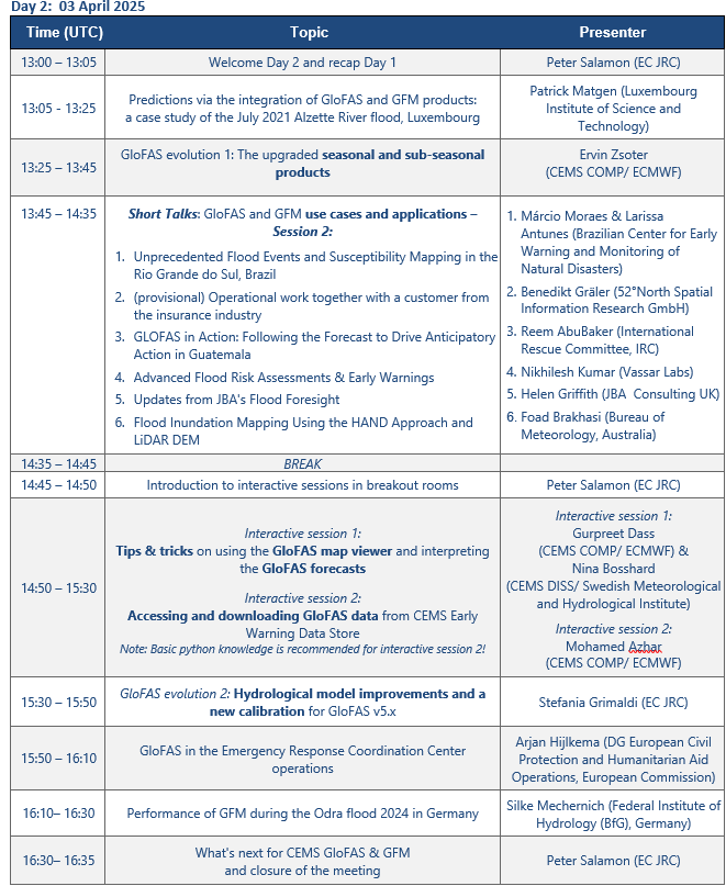 The meeting agenda features presentations by CEMS GloFAS and GFM developers on recent and upcoming updates, keynotes and talks by GloFAS and GFM users, and hands-on workshops to explore the use of GloFAS and GFM data and products. Participants will be able to discuss their work, connect with CEMS GloFAS and GFM communities, and expand their networks.